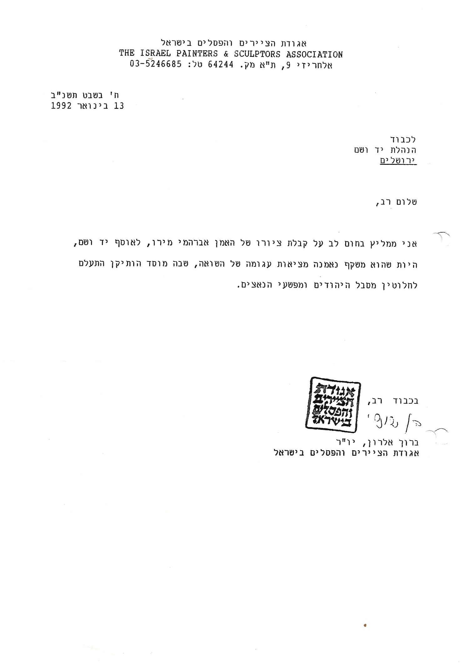 Letter from Baruch Elron 1992ברוך אלרון, יושב ראש אגודת הציירים והפסלים דאז, המליץ בחום לב על קבלת ציור זה של מירו אברהמי לאוסף יד ושם.